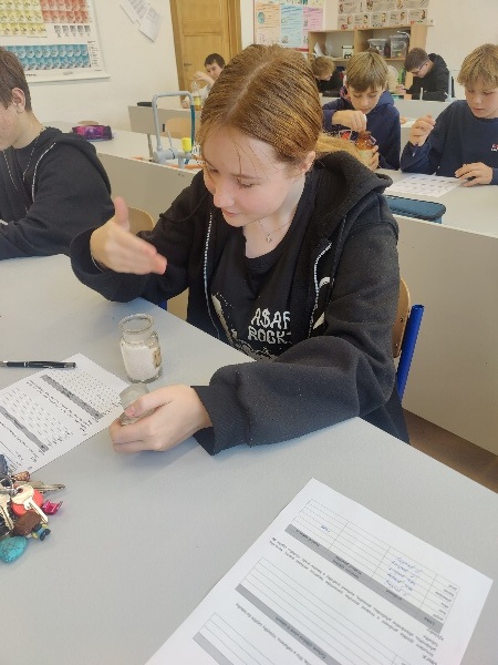 Žáci 8. tříd se v hodině chemie aktivně zapojili do laboratorní práce na téma Zjišťování vlastností látek. Během praktického zkoumání využili své smysly – zrak, čich a hmat – k popisu látek, jako jsou vzduch, cukr, síra, benzin, voda či kov. Zaměřili se na určení skupenství, barvy, vůně nebo zápachu, pružnosti, hrubosti povrchu a prozkoumali také teplotní vodivost u různých vzorků (např. korek, plast, sklo, pryž). Tato práce jim pomohla lépe pochopit, jak se látky liší a jakými způsoby lze jejich specifické vlastnosti zjistit. Získané poznatky jsou skvělým základem pro další studium chemie. Mgr. P. Polejová