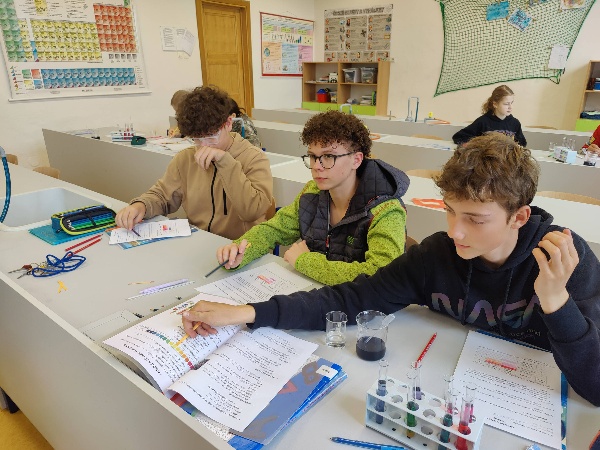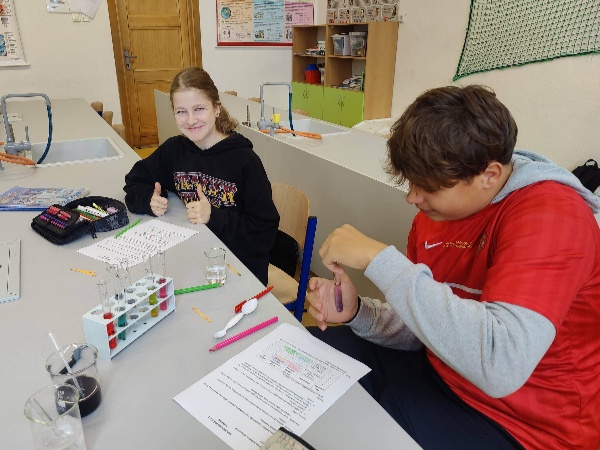 Žáci 9. tříd se proměnili v malé chemiky a pustili se do zajímavé laboratorní práce na téma Indikátory. Úkolem bylo zjistit, jak různé látky ovlivňují barvu přírodního indikátoru – vývaru z červeného zelí. Tento rostlinný výluh obsahuje látky, které reagují na změnu pH (kyselost nebo zásaditost) prostředí. Žáci s napětím sledovali, jak se jejich roztok mění z fialové na jasně červenou (v kyselém prostředí, např. ocet) až po modrou nebo zelenou (v zásaditém prostředí, např. s jedlou sodou). Práce nejenže ukázala praktické využití indikátorů, ale také názorně předvedla, jak lze pomocí jednoduchých přírodních prostředků efektivně testovat chemické vlastnosti látek v běžném životě. Mgr. P. Polejová
