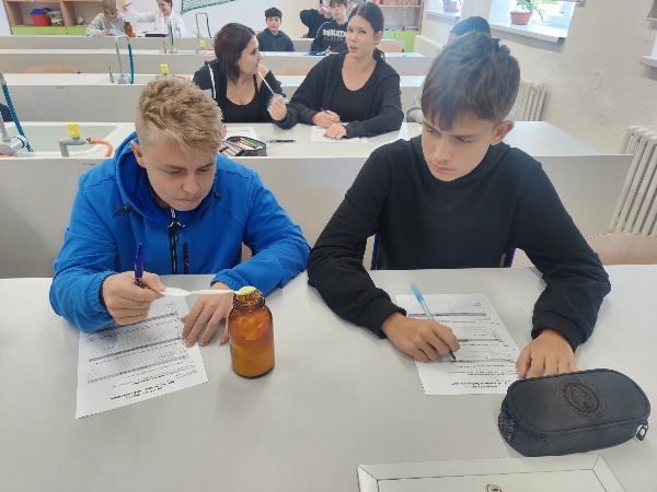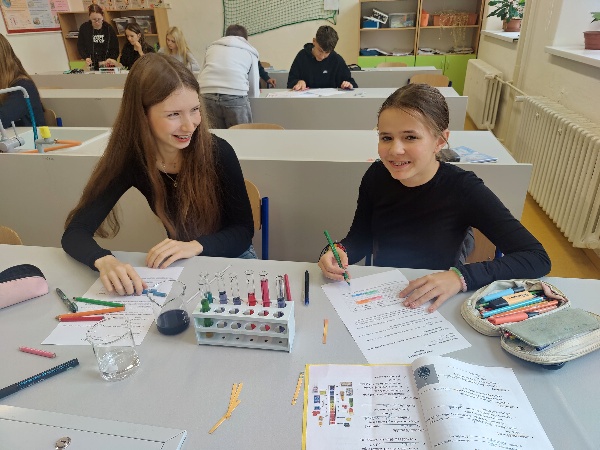 Žáci 8. tříd se v hodině chemie aktivně zapojili do laboratorní práce na téma Zjišťování vlastností látek. Během praktického zkoumání využili své smysly – zrak, čich a hmat – k popisu látek, jako jsou vzduch, cukr, síra, benzin, voda či kov. Zaměřili se na určení skupenství, barvy, vůně nebo zápachu, pružnosti, hrubosti povrchu a prozkoumali také teplotní vodivost u různých vzorků (např. korek, plast, sklo, pryž). Tato práce jim pomohla lépe pochopit, jak se látky liší a jakými způsoby lze jejich specifické vlastnosti zjistit. Získané poznatky jsou skvělým základem pro další studium chemie. Mgr. P. Polejová