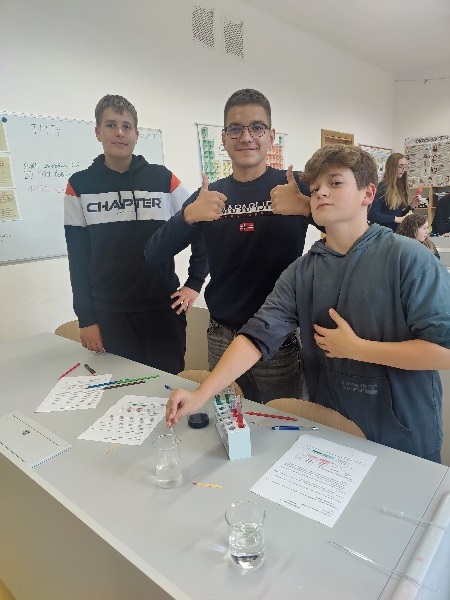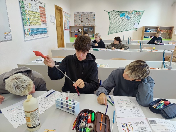 Žáci 9. tříd se proměnili v malé chemiky a pustili se do zajímavé laboratorní práce na téma Indikátory. Úkolem bylo zjistit, jak různé látky ovlivňují barvu přírodního indikátoru – vývaru z červeného zelí. Tento rostlinný výluh obsahuje látky, které reagují na změnu pH (kyselost nebo zásaditost) prostředí. Žáci s napětím sledovali, jak se jejich roztok mění z fialové na jasně červenou (v kyselém prostředí, např. ocet) až po modrou nebo zelenou (v zásaditém prostředí, např. s jedlou sodou). Práce nejenže ukázala praktické využití indikátorů, ale také názorně předvedla, jak lze pomocí jednoduchých přírodních prostředků efektivně testovat chemické vlastnosti látek v běžném životě. Mgr. P. Polejová